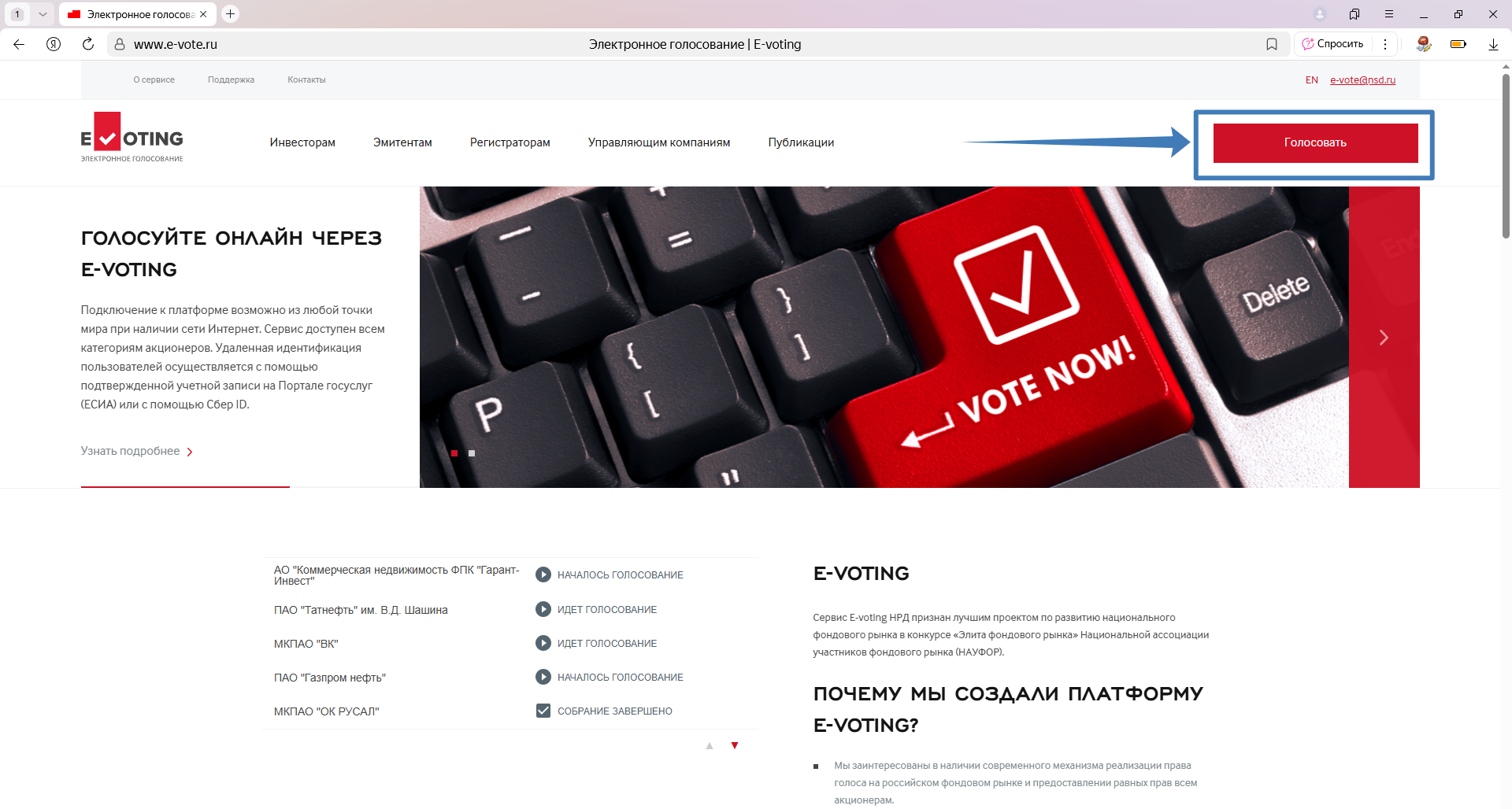 - Перейдите на сайт e-vote.ru и нажмите на кнопку «Голосовать» в правом верхнем углу страницы.