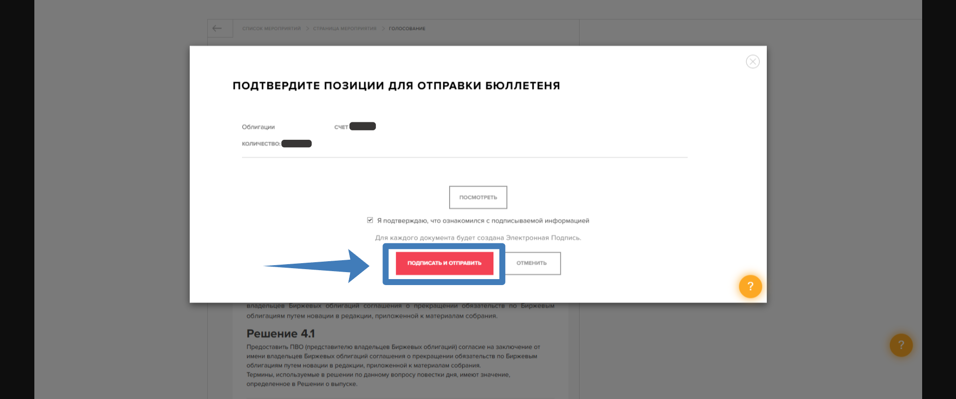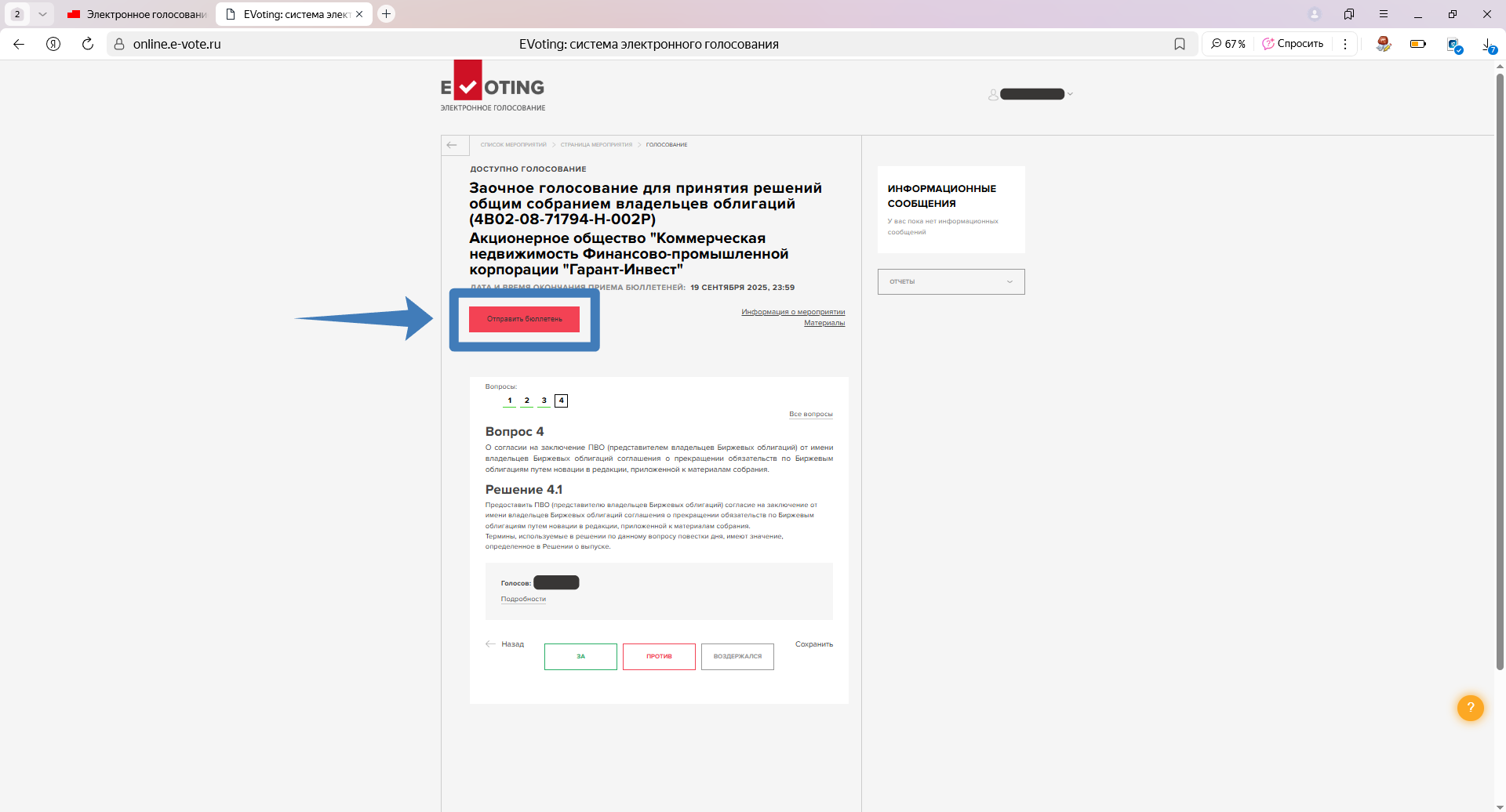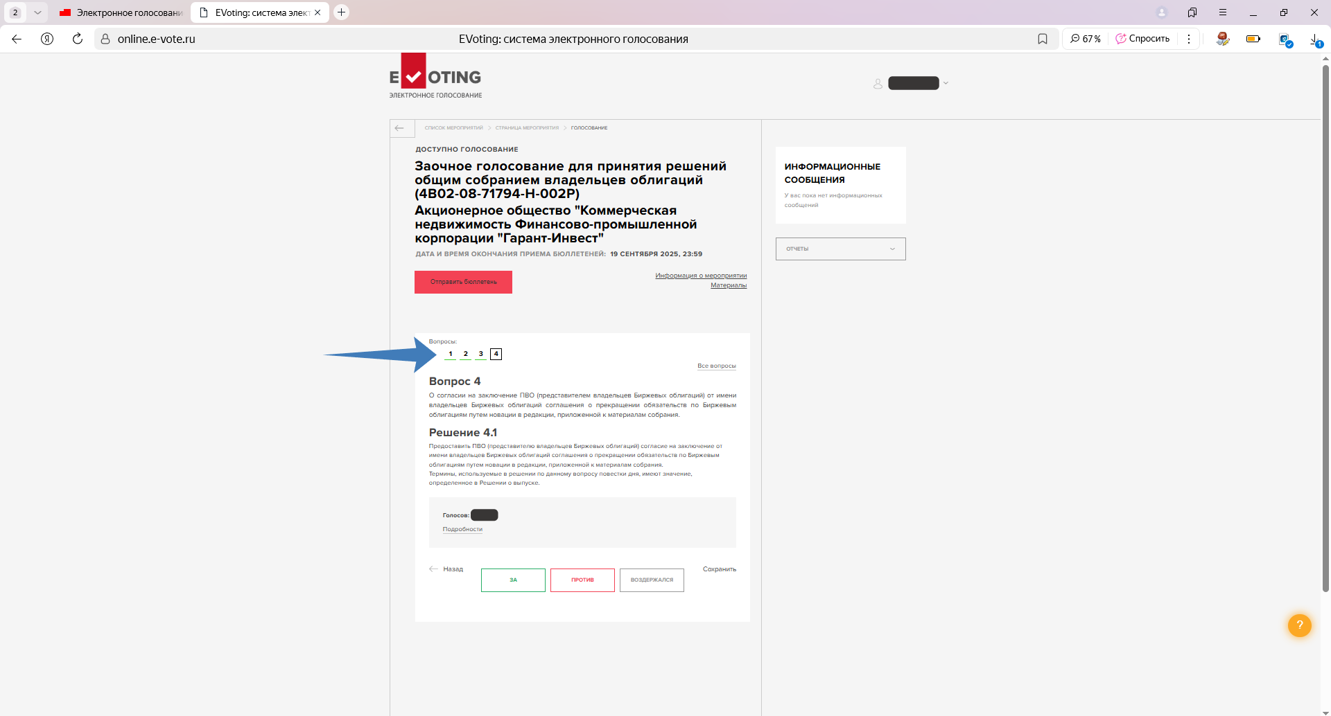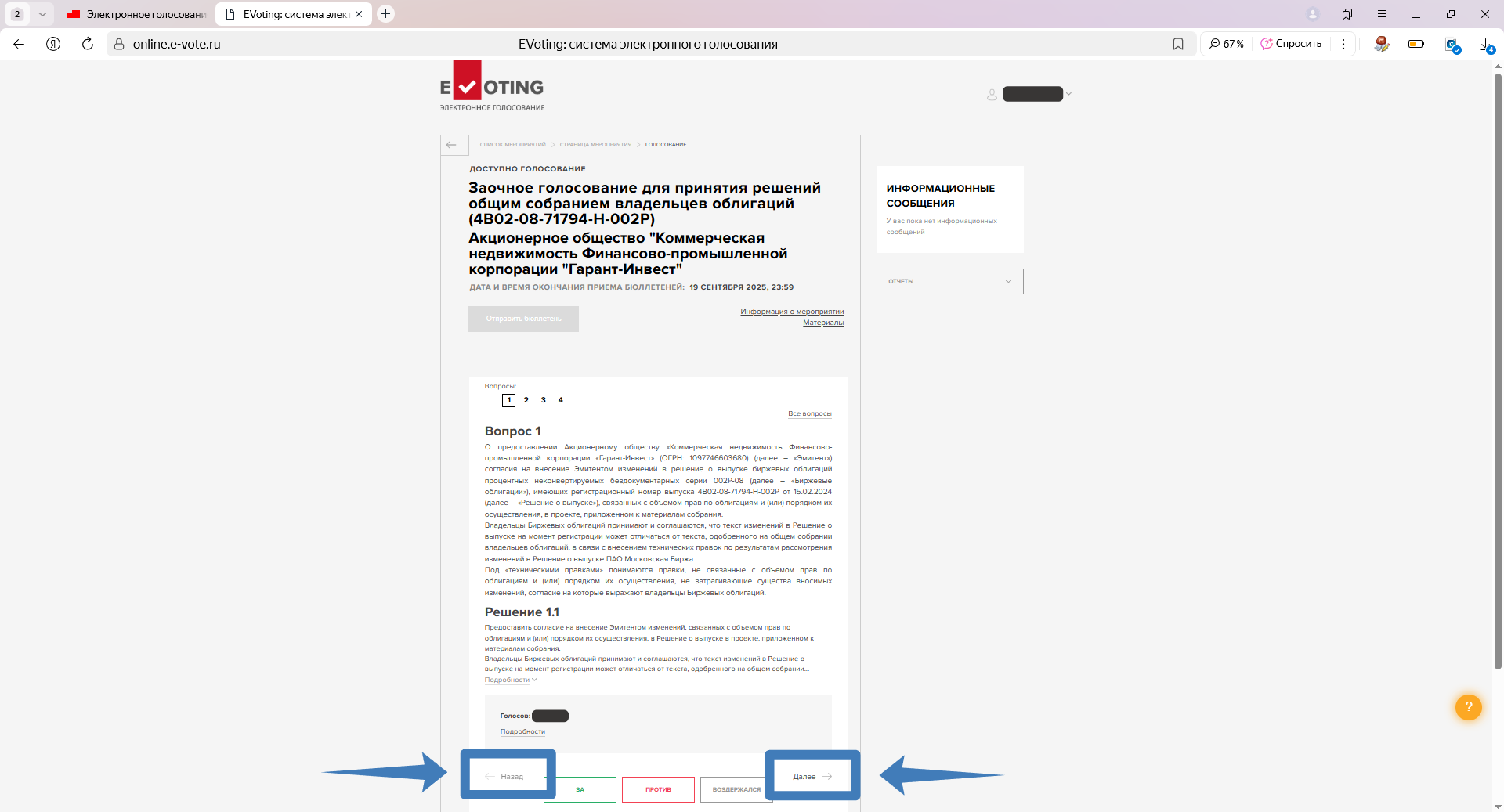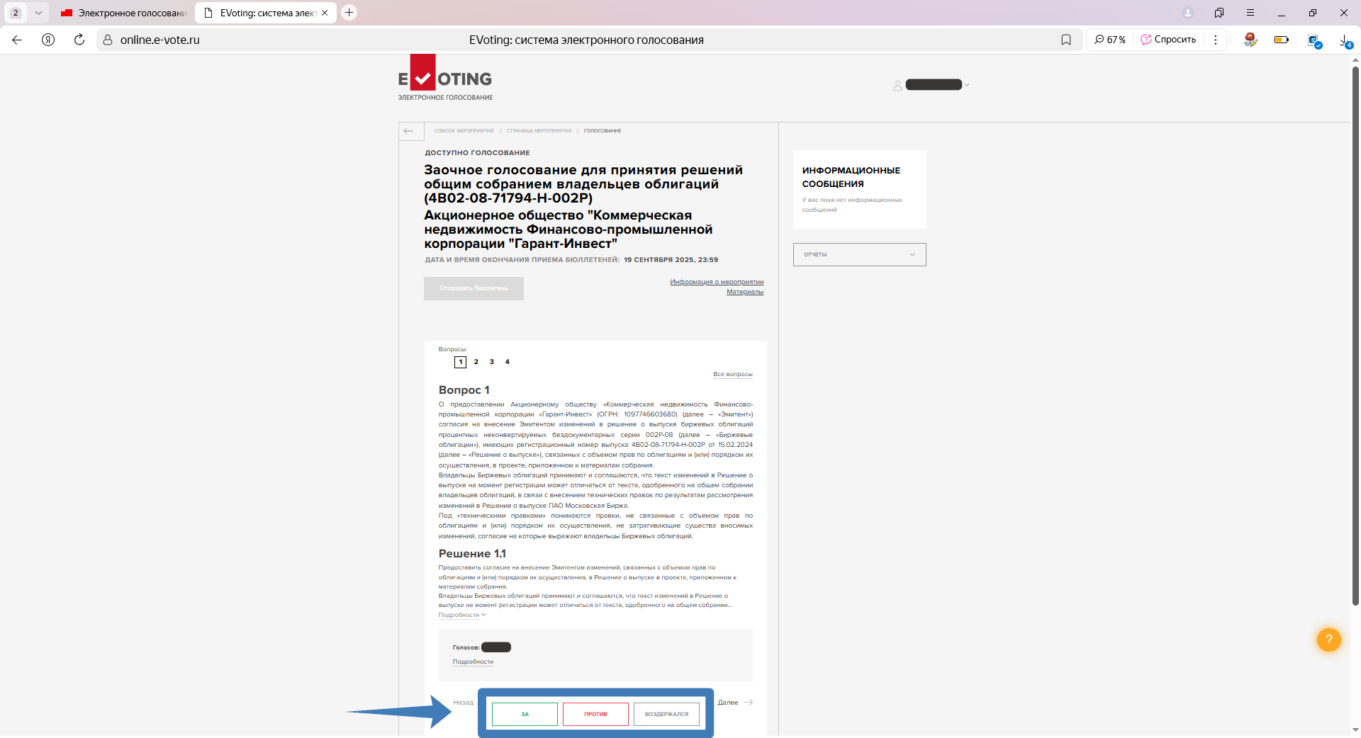 8. Откроется первый вопрос повестки дня общего собрания владельцев облигаций. Кнопки голосования расположены после формулировок вопроса и предлагаемого решения, выносимого на общее собрание владельцев облигаций.