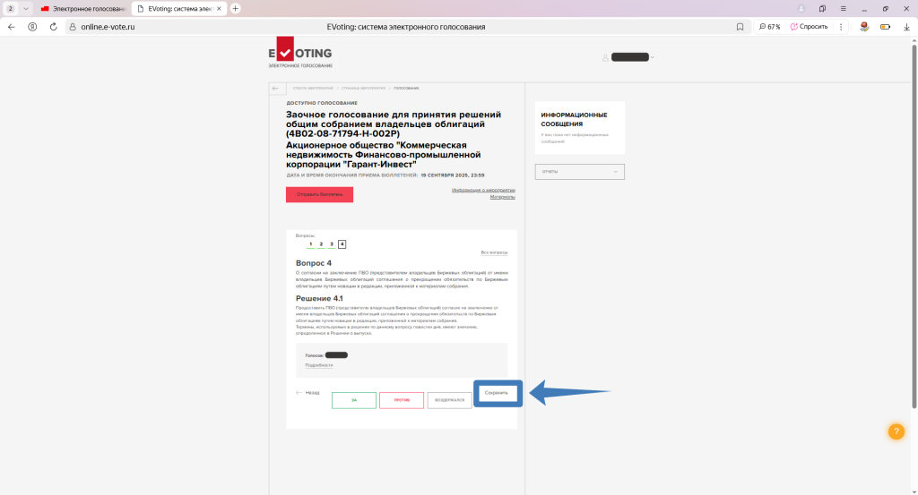 11. Чтобы сохранить выбранные вами варианты голосования и вернуться к отправке бюллетеня позднее, нажмите кнопку «Сохранить». Она доступна в последнем вопросе повестки дня.