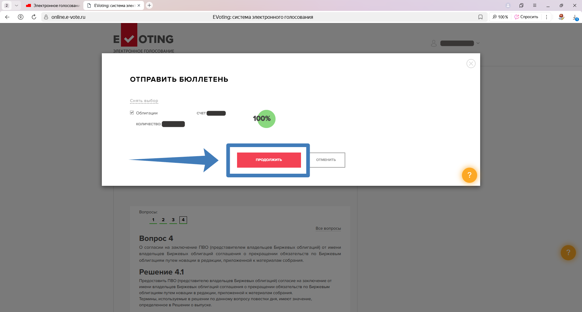 13. Для окончательного подтверждения выбранных вами вариантов голосования и отправки бюллетеня потребуется нажать кнопку «Продолжить».