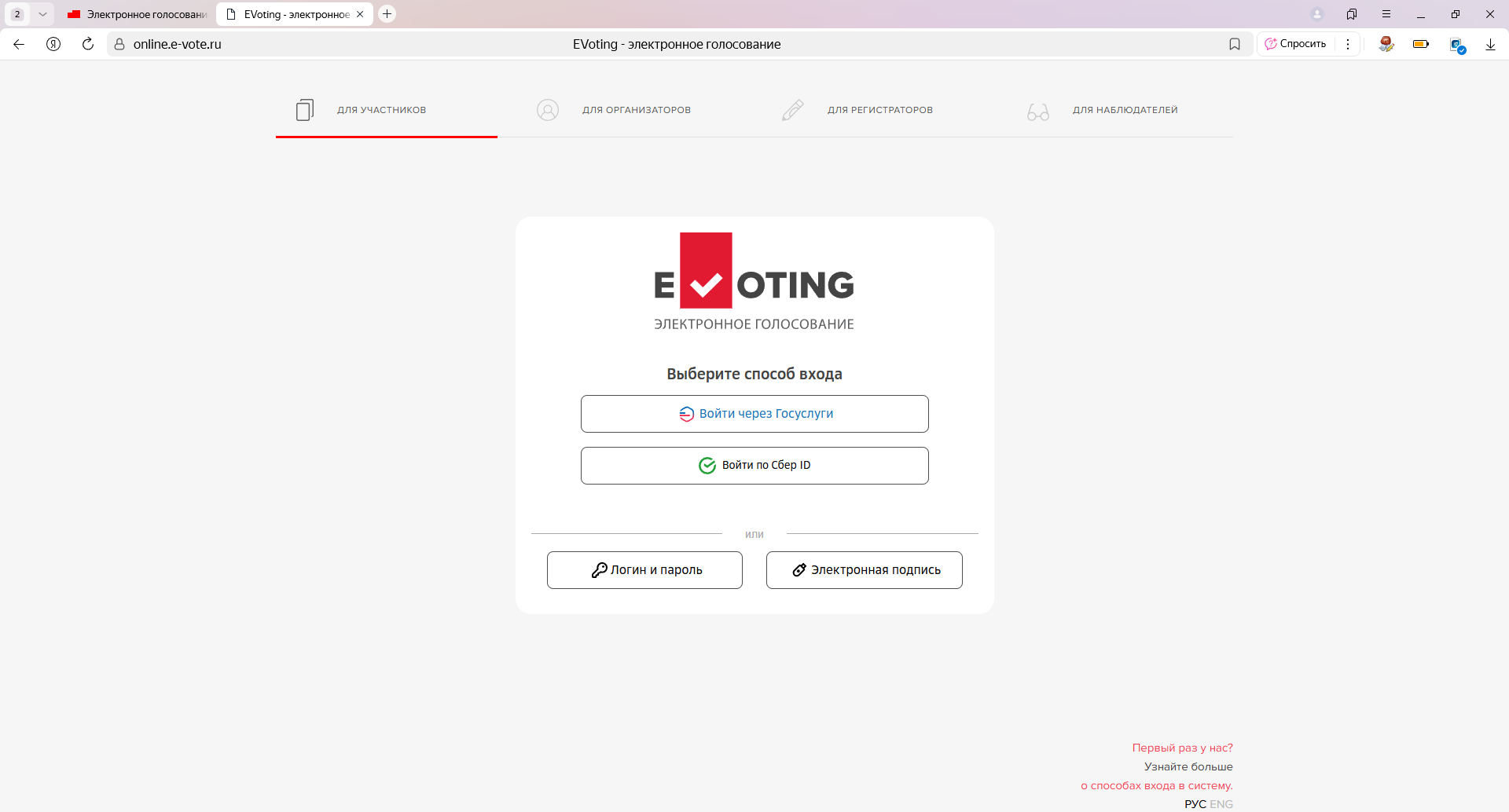 2. Откроется страница авторизации. Чтобы воспользоваться сервисом E-voting, потребуется подтвержденная учетная запись на Госуслугах или Сбер ID.