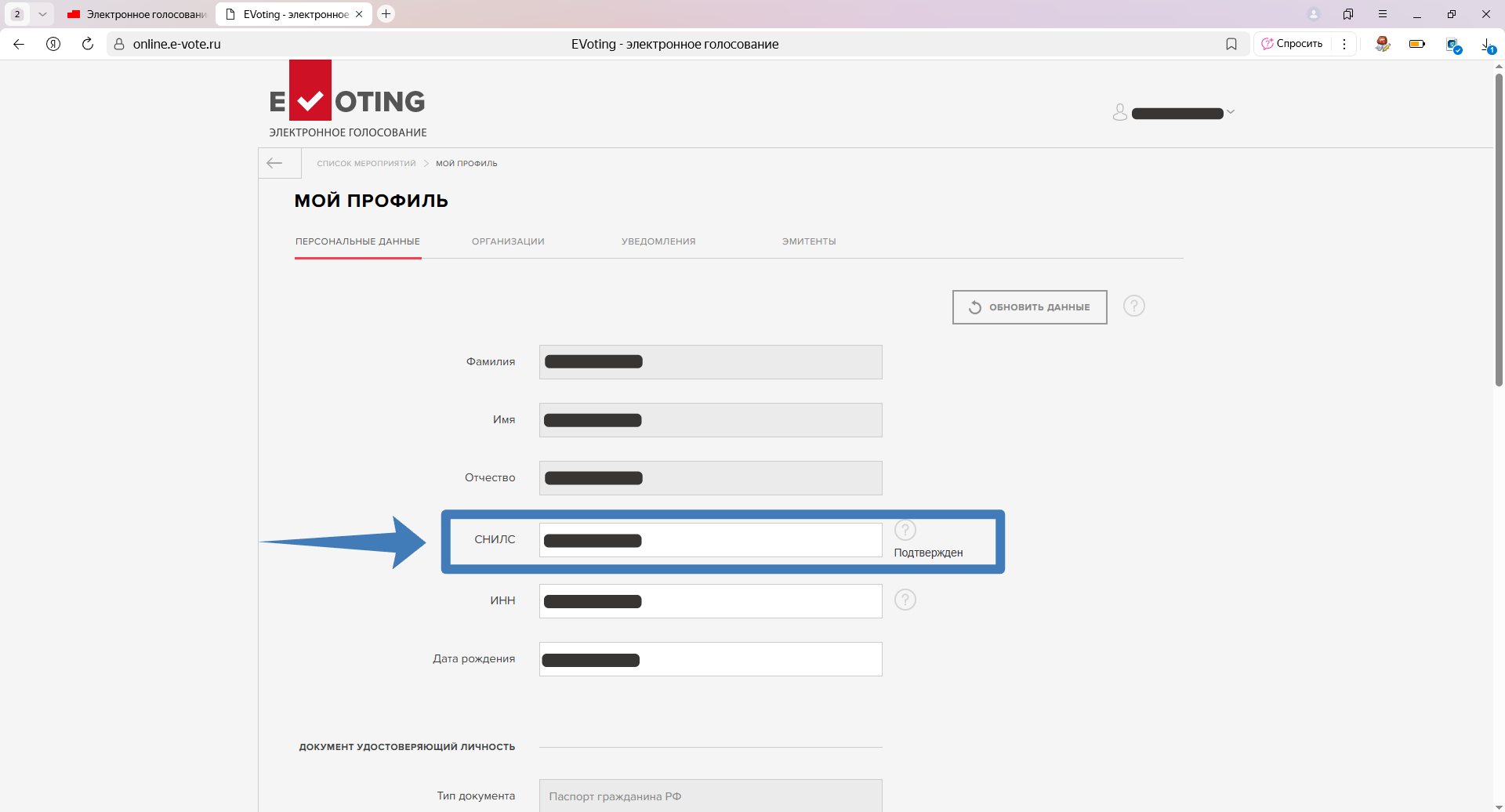 4. Для голосования на общем собрании владельцев облигаций также потребуется подтвердить ваш СНИЛС. Для этого необходимо перейти в профиль.