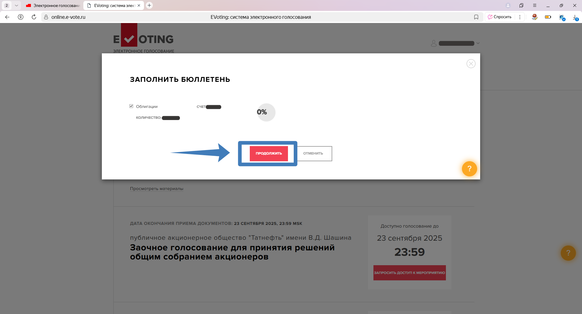 7. Если нужное вам голосование уже доступно, то нажмите кнопку «Проголосовать», а затем «Продолжить».