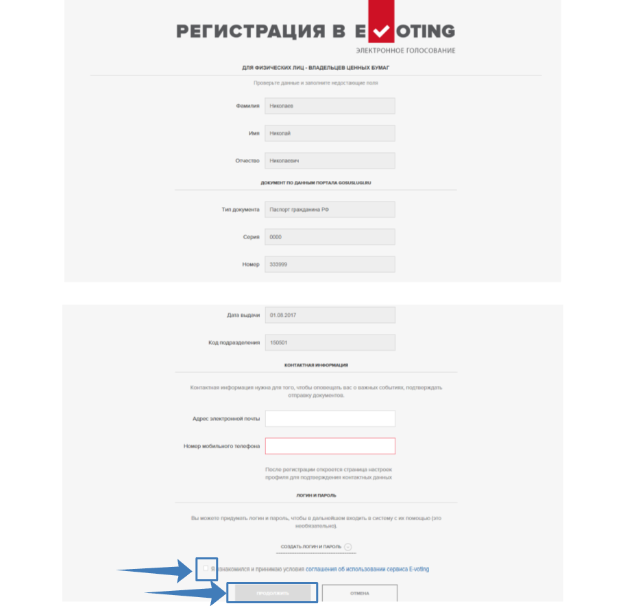 3. После авторизации с помощью Госуслуг или Сбер ID потребуется заполнить форму регистрации в сервисе E-voting. После заполнения всех необходимых полей потребуется проставить галочку о согласии с условиями использования сервиса и нажать кнопку «Продолжить». Процедура регистрации проходится только один раз.